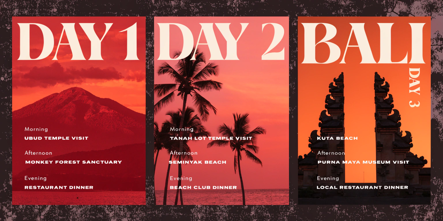 | Day 1-2 | Explore cultural sites, temples, rice terraces | Ubud | Sacred Monkey Forest, Tegallalang |